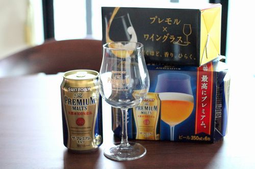 そして翌日、サントリーさんから届いたワイングラスとプレモルのセット!