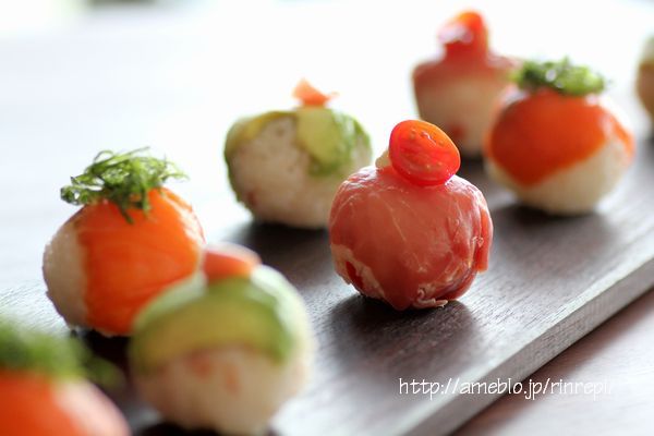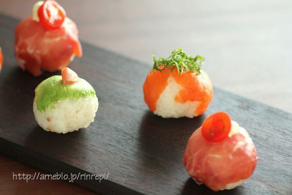 生ハムとアメーラトマトの手まり寿司。