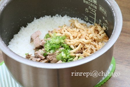 ② いつもより少しかために炊いたご飯に、卵以外の材料を全て混ぜる。