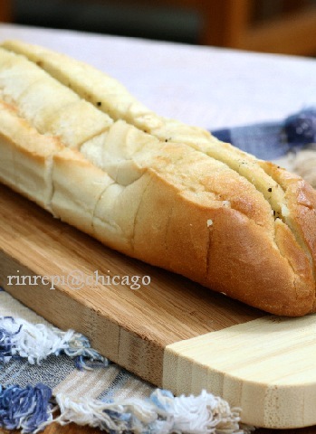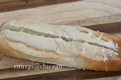 ② バゲットに縦、横に切れ目を入れ(切り分けず、底の部分には包丁を入れない)
