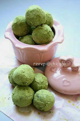②をスプーンなどですくいとり、手で丸めバットの中で転がし抹茶きな粉をまぶす。