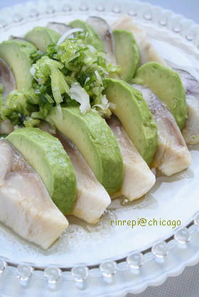アボカドとしめ鯖を薄切りにして交互に並べ葱みじん切りを乗せる。