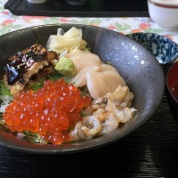 海鮮の宝石箱や~~~!って聞こえてきそうな丼。いくらと、ほたてと、あなごの3色どんぶり。3種とも、石巻市の雄勝の海でとれたものです。 いくらもほたても・・・ホタテはひもも、と~~~ってもおいしかった(*^^)vあなごはふわふわ~。タレの甘辛かげんも最高に素敵でし