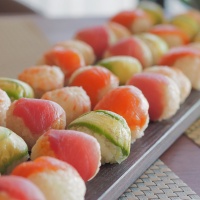 週末のおうちパーティーのお料理の一品アメリカンロール風てまり寿司。トップの画像、とってもきれいでしょー。来てくれた友人の一人で、ゆるかわ的な写真で有名な、ぷるめりあんが撮ってくれたものです。パーティー全体の写真を掲載してくれているのでぜひぜひリンク先に飛