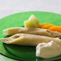 朝型生活が続いていますよ~これも早朝、夜と朝の間くらいの時間に焼いた米粉のクレープです。米粉のクレープは、モチもちの食感が本当においしくて、焼きたてを、何もつけずに食べてもおいしいほどですが、今回は、中身をたっぷりこんもり詰め込みました。何を包んでもおい